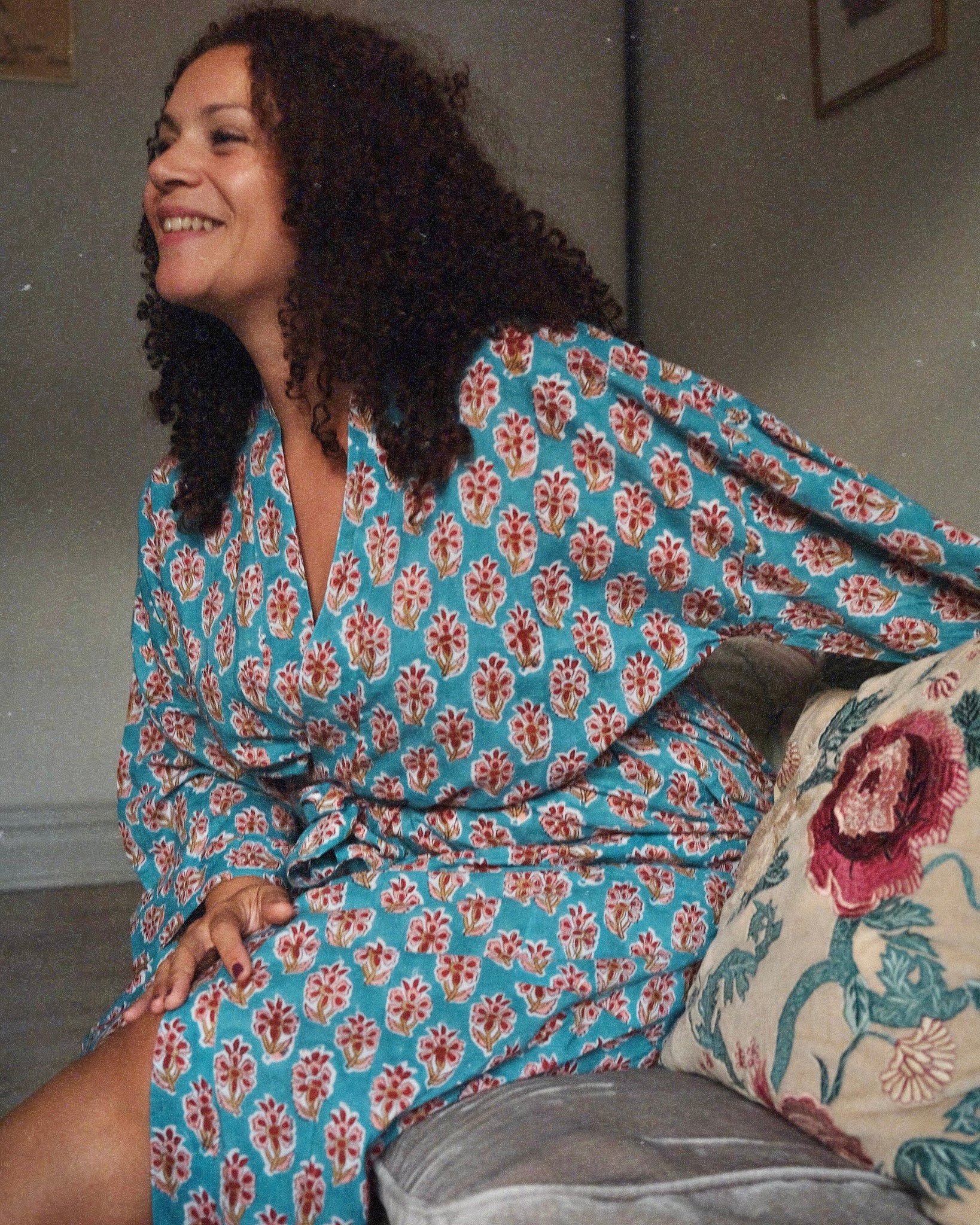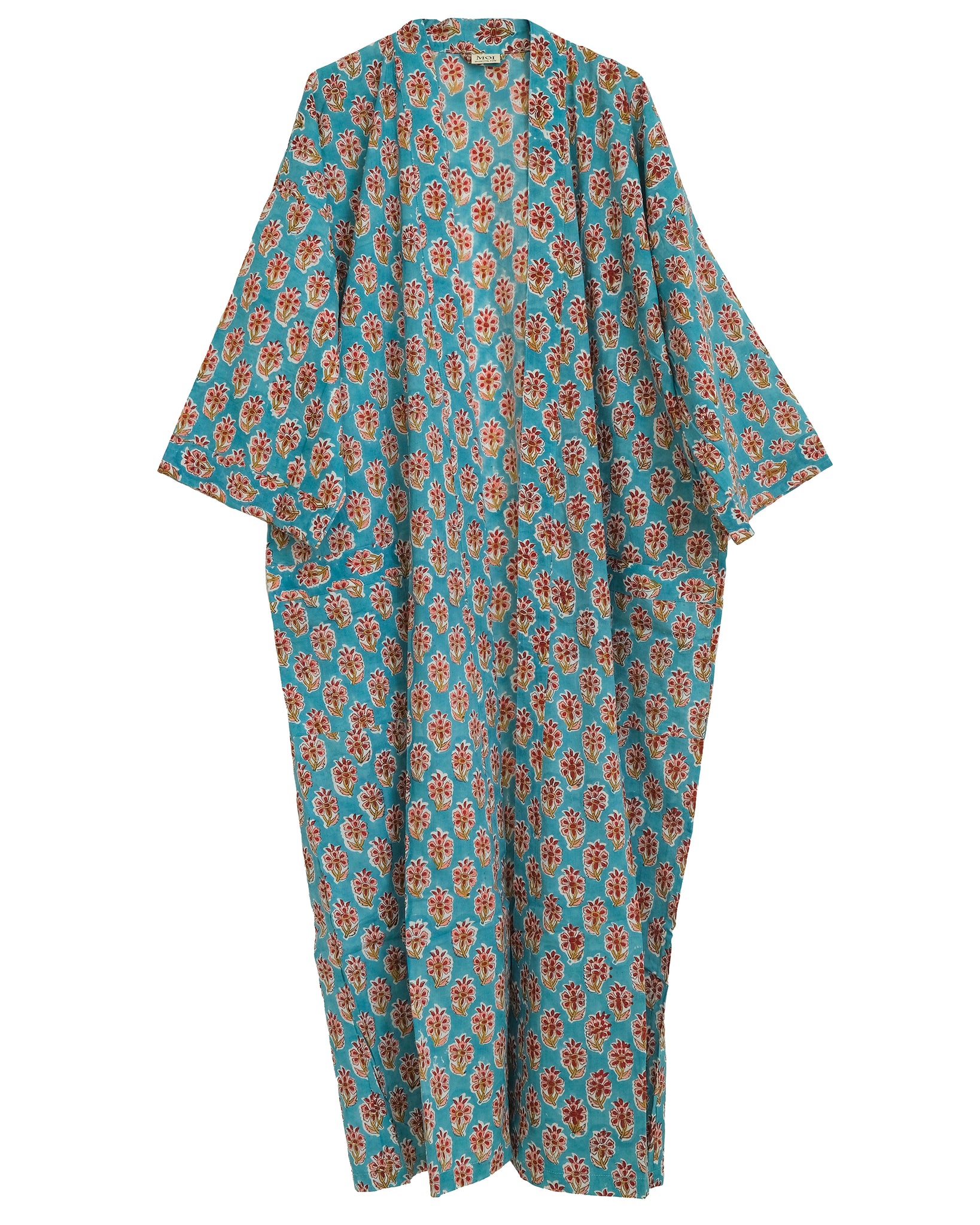 Morgenkåbe i håndtrykt, blødt bomuldsstof med et mønster.