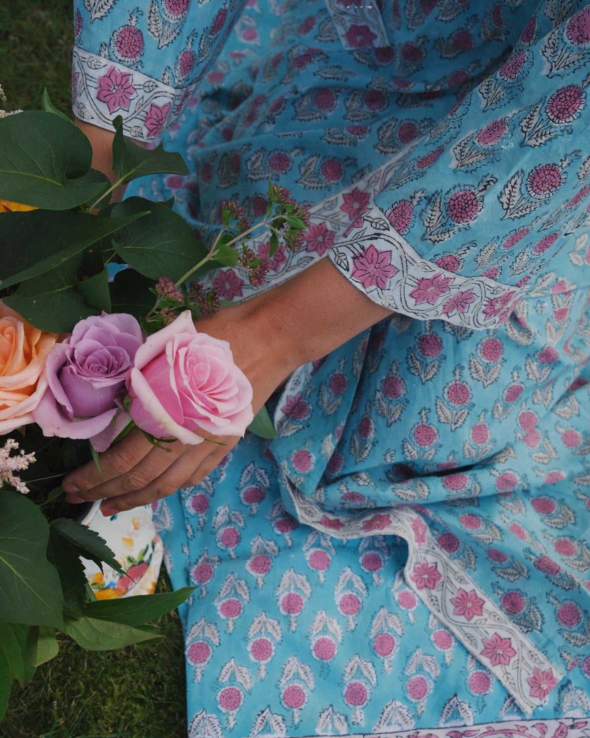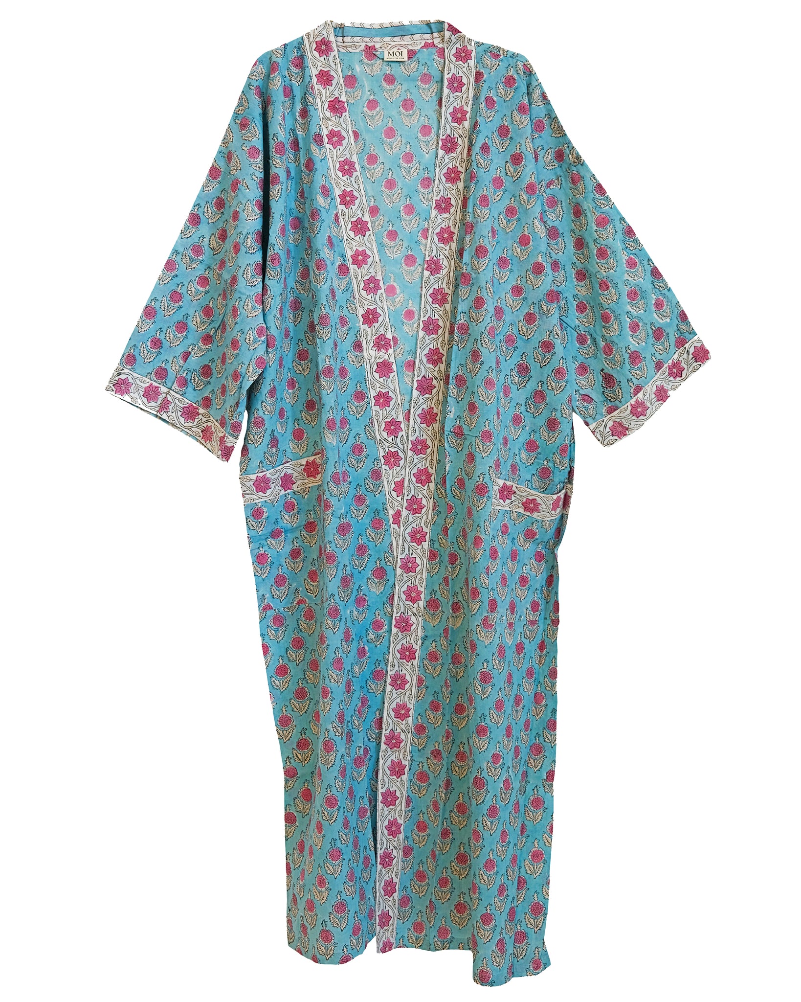Morgenkåbe i håndtrykt, blødt bomuldsstof med et mønster.